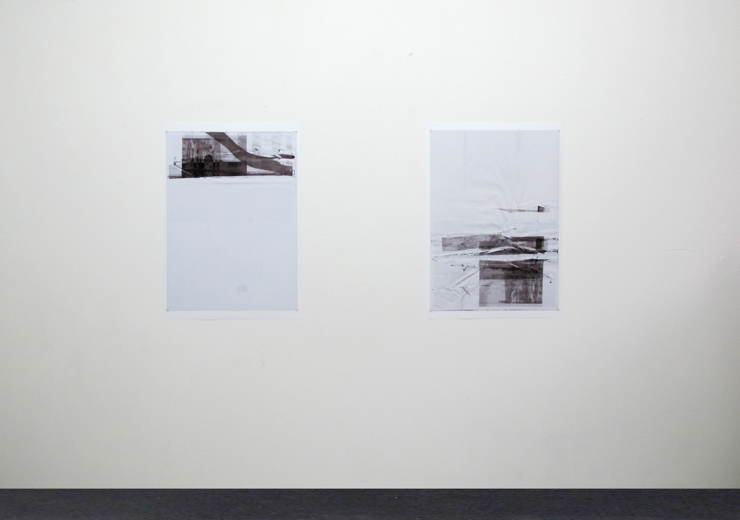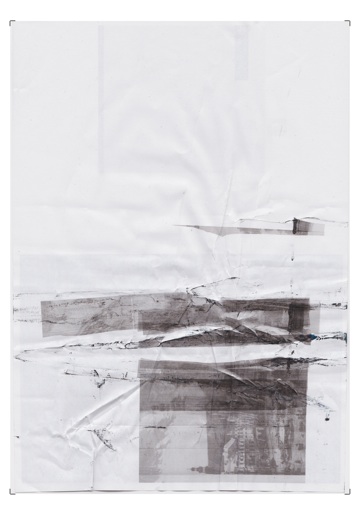 OHNE TITEL, 2016, 2 PIGMENTDRUCKE VON SCANS VORDER- UND RÜCKSEITIG BEDRUCKTER UND IM DRUCKER GEKNÜLLTER PAPIERE, JE 100 X 70 CM